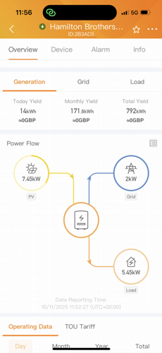 Even in November, the system is performing brilliantly. Live monitoring shows the client is meeting their full on-site energy demands directly from solar, with surplus power being exported back to the grid — generating additional income through export payments.
